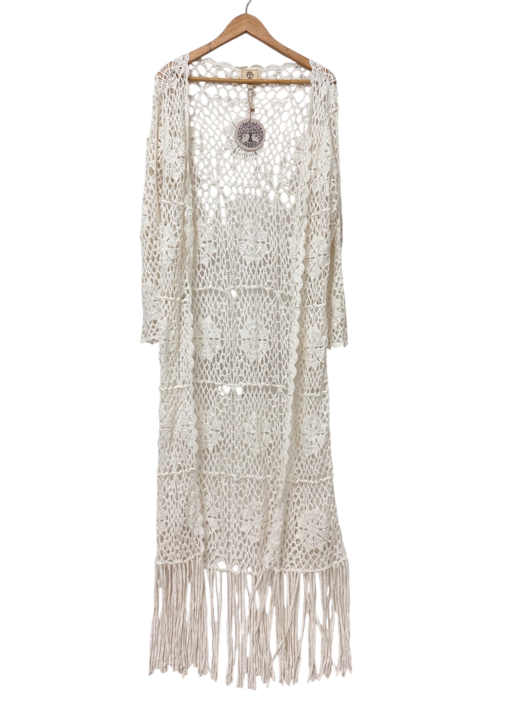 Isabella White Crocheted Maxi Kimono Cover Up – Free Size Cotton
