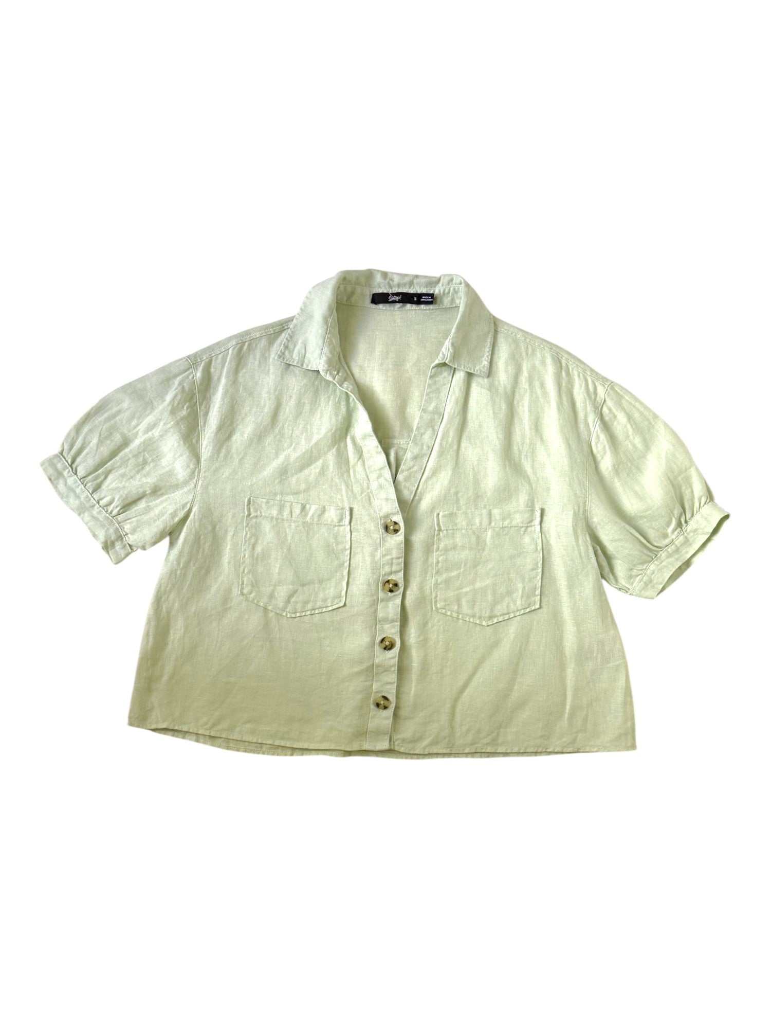 Add a fresh touch to your summer wardrobe with this thrifted Sportsgirl pastel green linen shirt, a timeless piece that’s both chic and breathable. Crafted from 100% high-quality linen, this top is designed in a relaxed silhouette with subtle semi puffed sleeves for a feminine, modern twist.