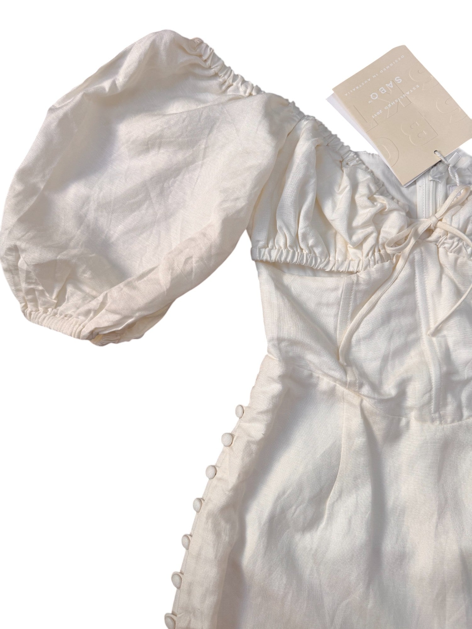 Bring a touch of effortless charm to your wardrobe with this SABO white linen-blend mini dress. Featuring romantic puff sleeves, a sweetheart neckline, and a playful cut-out under the chest, this dress perfectly balances flirty details with summer-ready elegance. Crafted from a breathable linen-viscose blend, it offers comfort and structure—ideal for Dubai’s warm weather and stylish gatherings.