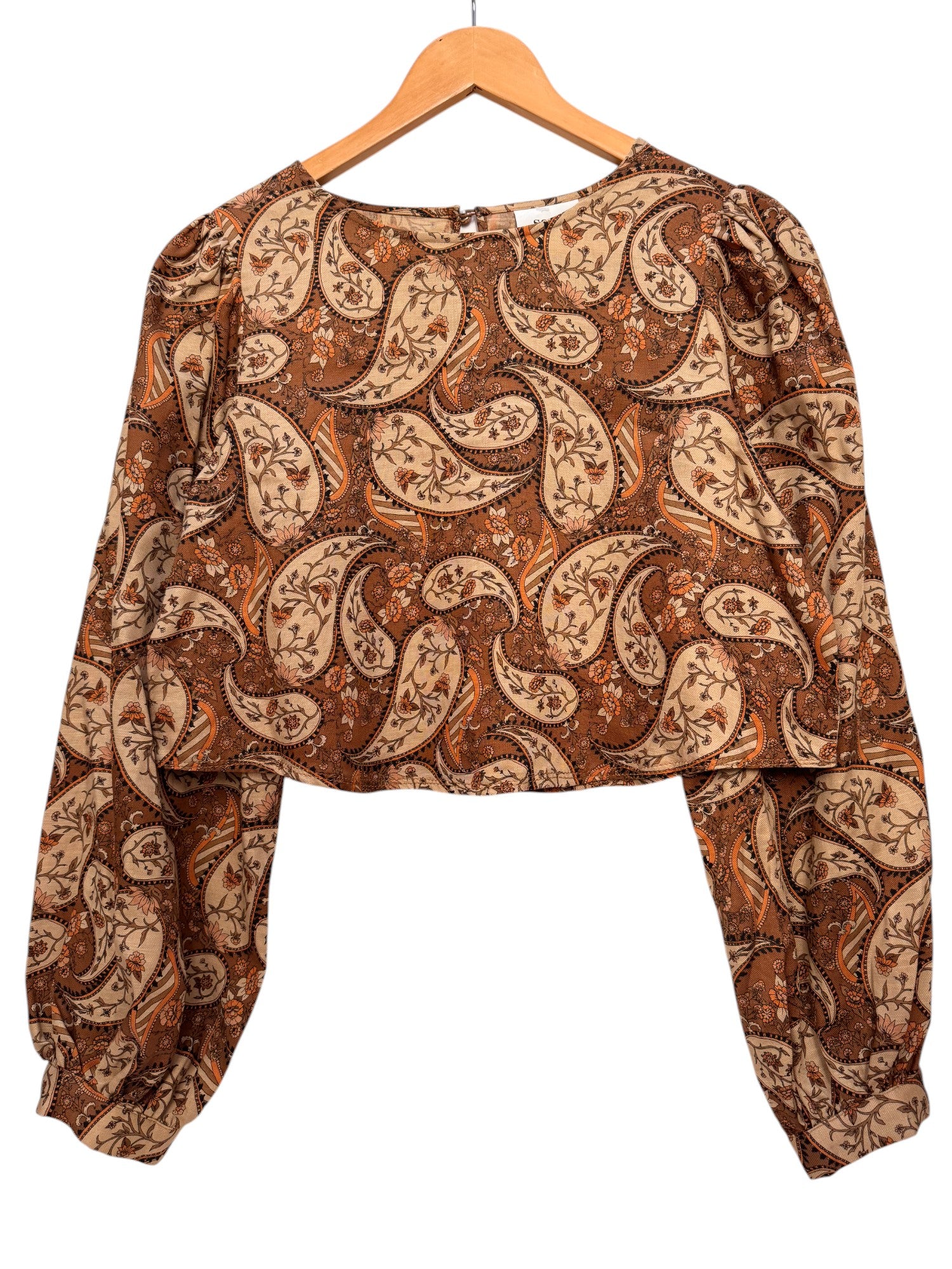 Seed Heritage Brown Paisley Print Linen-Lyocell Bishop Sleeve Top