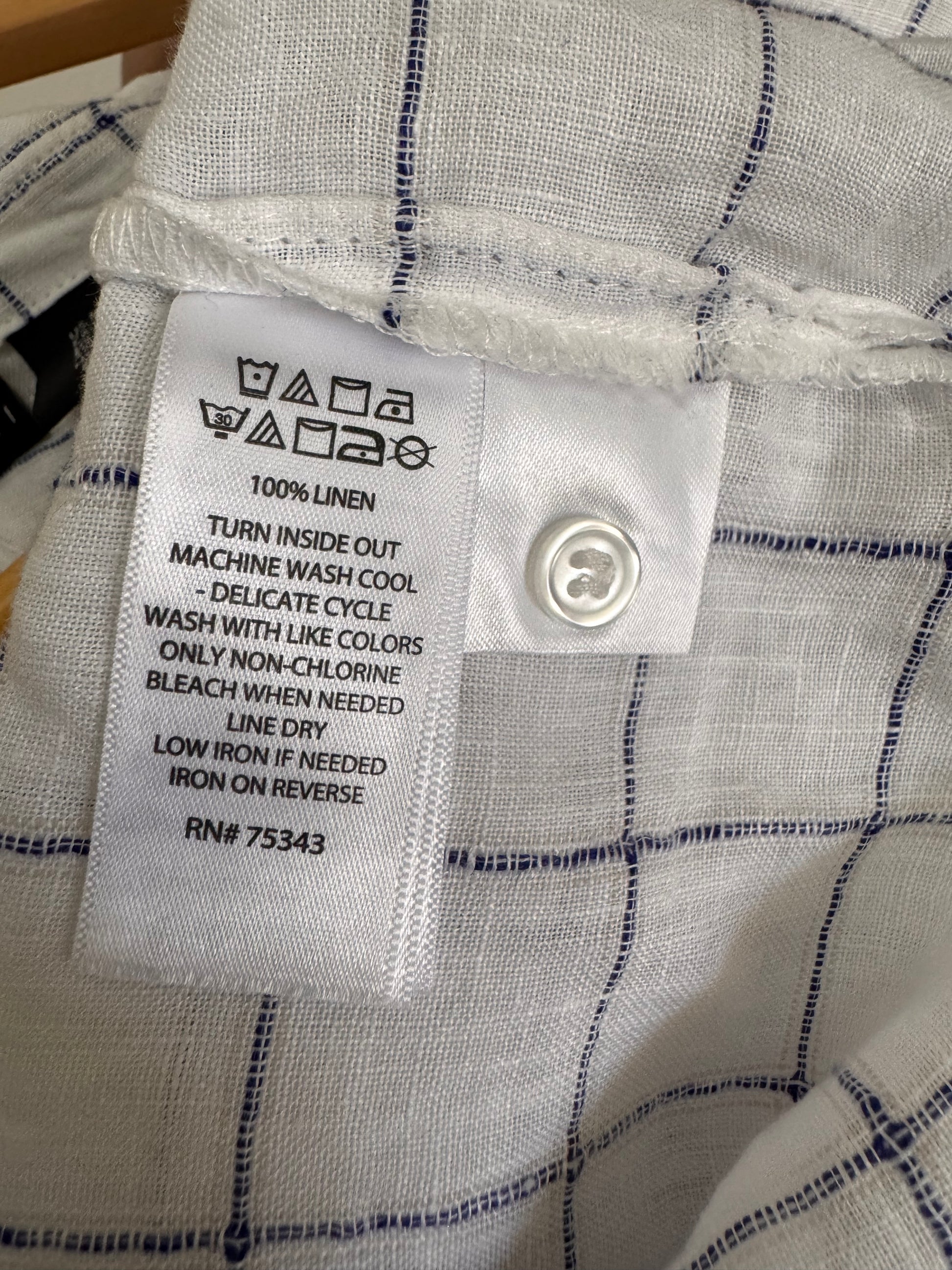 Upgrade your summer wardrobe with this thrifted Tahari white checked linen shirt, designed with a semi-open front and short sleeves for a relaxed yet refined look. Crafted from 100% breathable linen, this timeless shirt keeps you cool and stylish in Dubai’s warm weather. The subtle checkered design adds texture and a touch of effortless sophistication, making it a versatile piece for both work and casual days.
