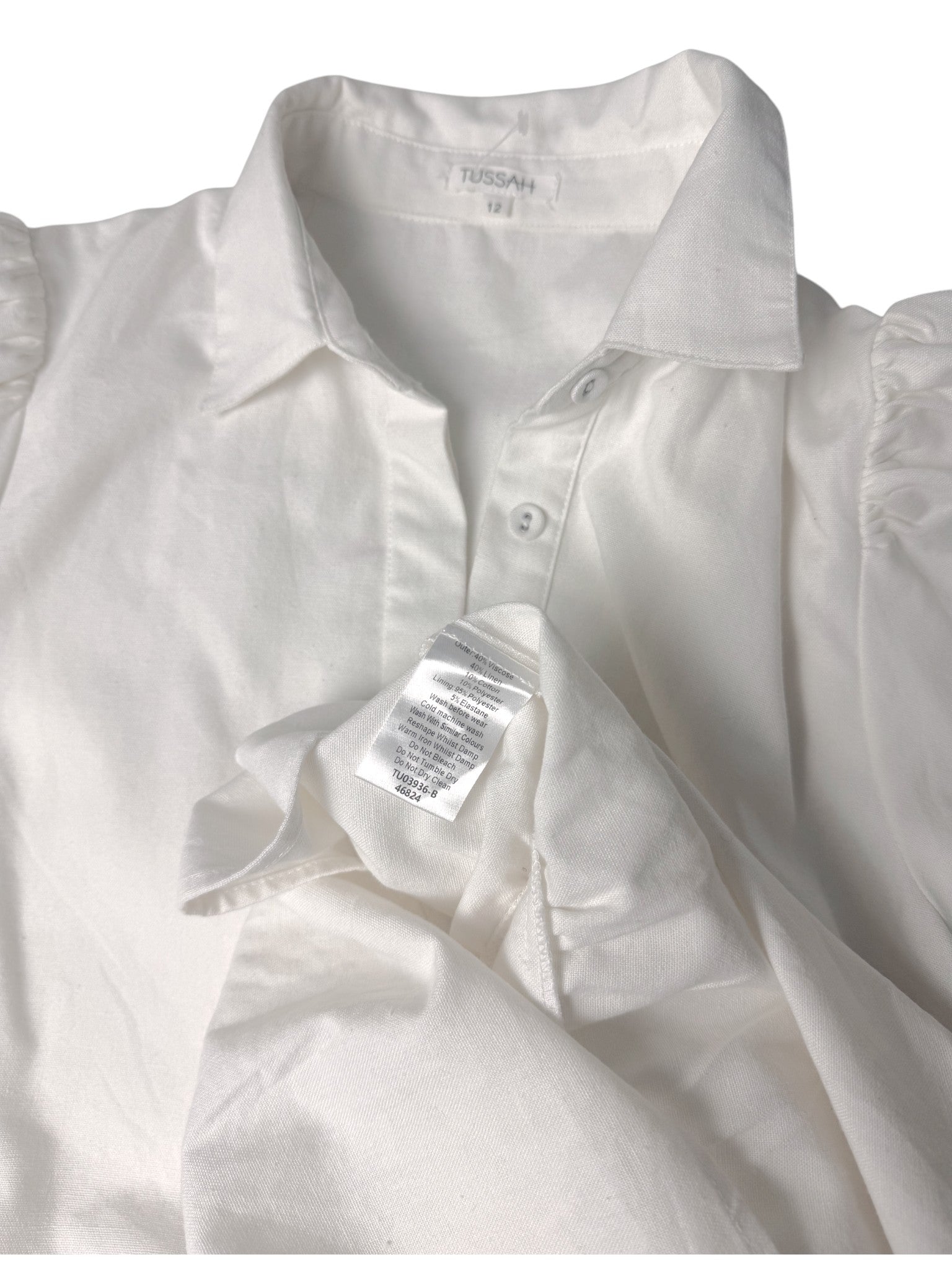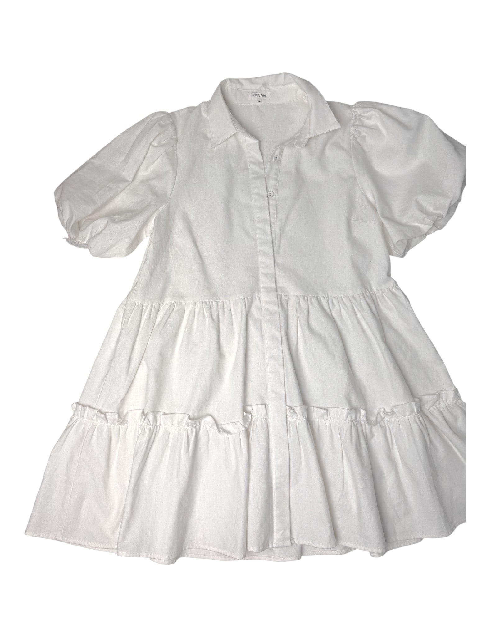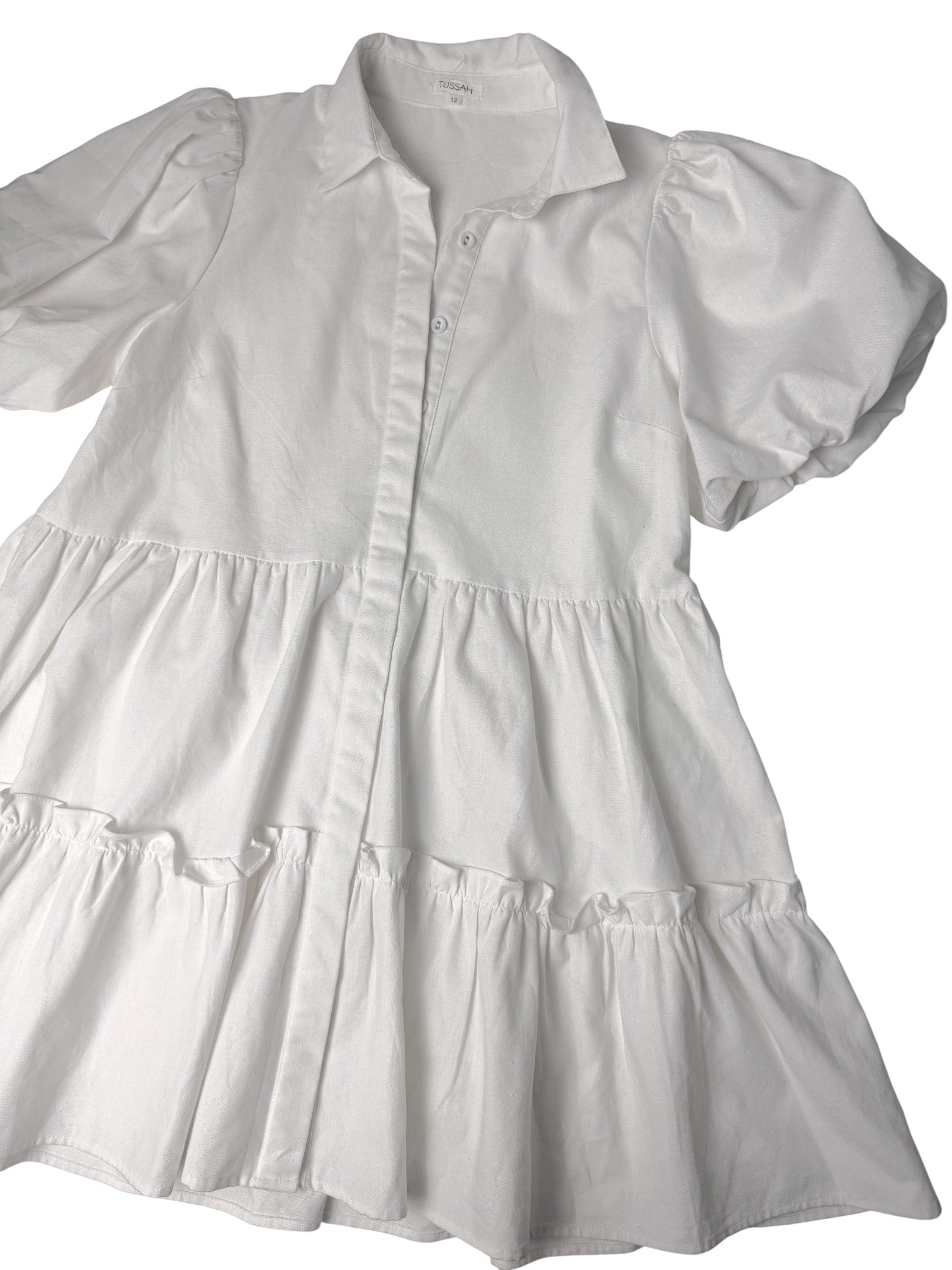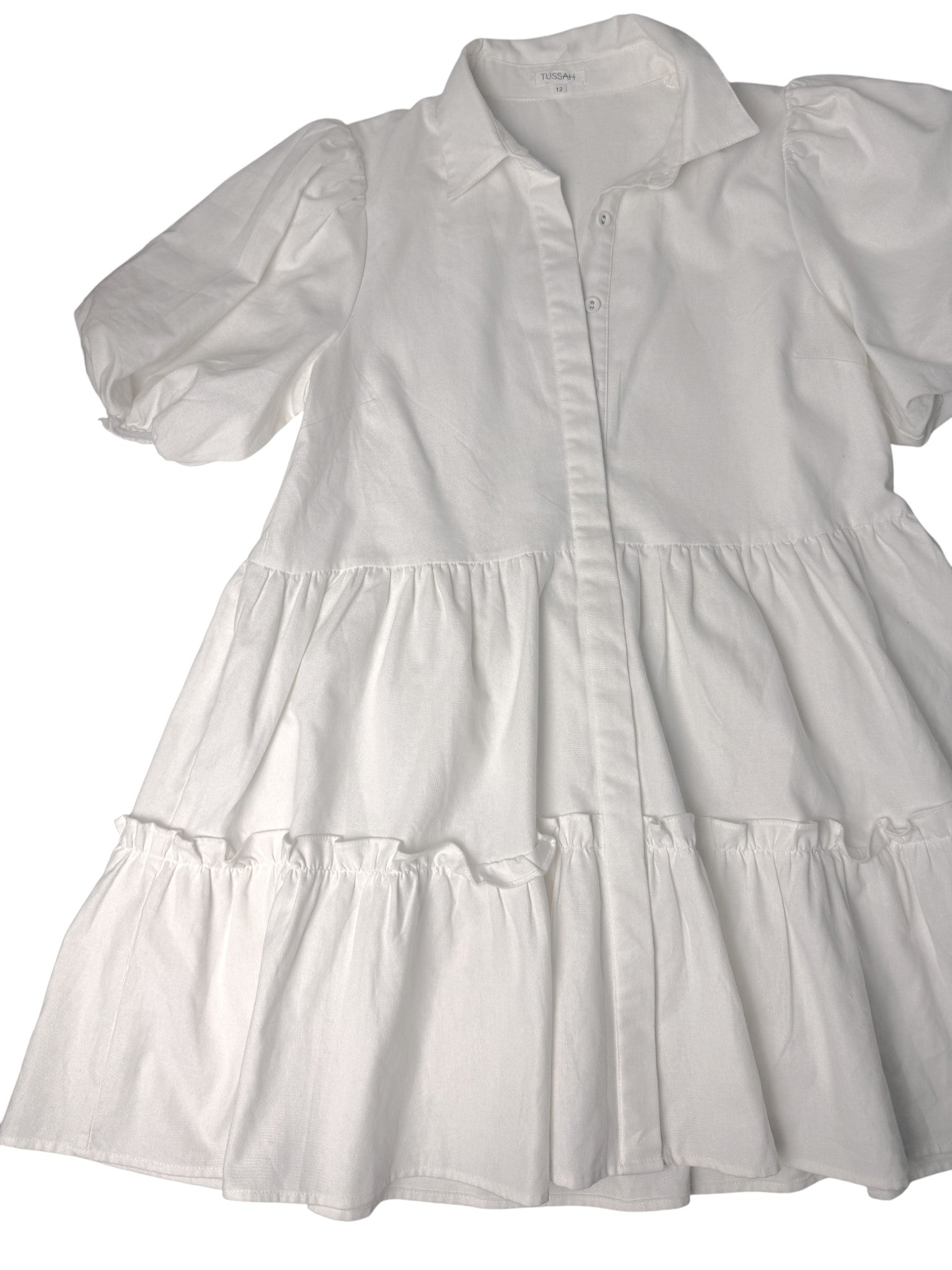 Embrace timeless elegance and effortless comfort with this Tussah white linen-blend tiered mini dress. Designed in a babydoll silhouette, this dress features puffed sleeves, a collared neckline, and a loose, flowy fit that flatters all body shapes. The linen-viscose-cotton blend gives it a soft, airy texture — perfect for Dubai’s sunny days and resort escapes. Ideal for brunch dates, holiday strolls, or casual office days, this piece captures that modern feminine aesthetic that never goes out of style.