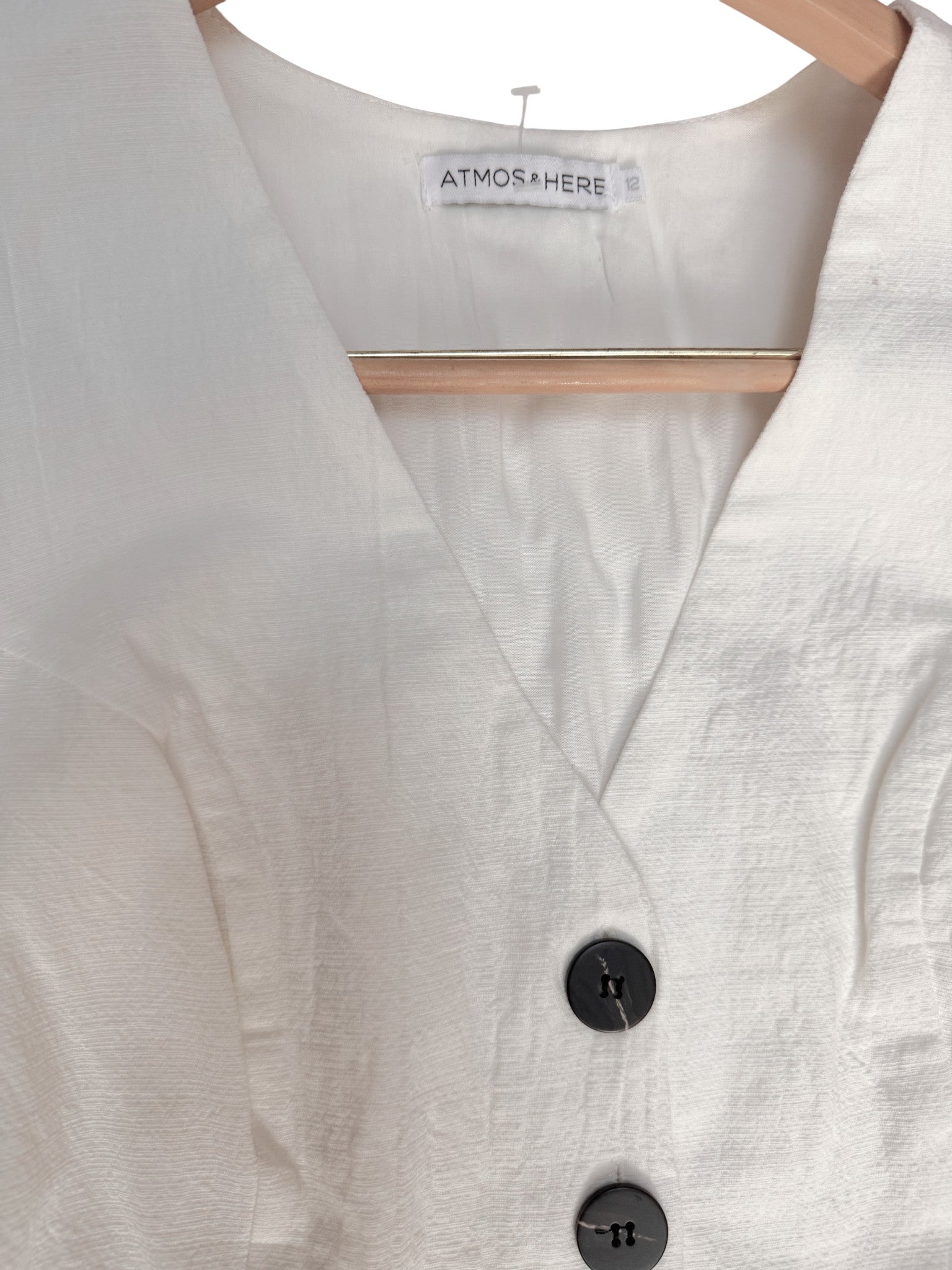 Add effortless charm to your summer wardrobe with this Atmos&Here white button-down mini dress. Crafted from 100% cotton with a linen-like texture, it offers a light, breathable feel perfect for Dubai’s warm weather. The V-neckline, black button accents, and structured yet relaxed fit give it a timeless and feminine silhouette that transitions beautifully from day to night.